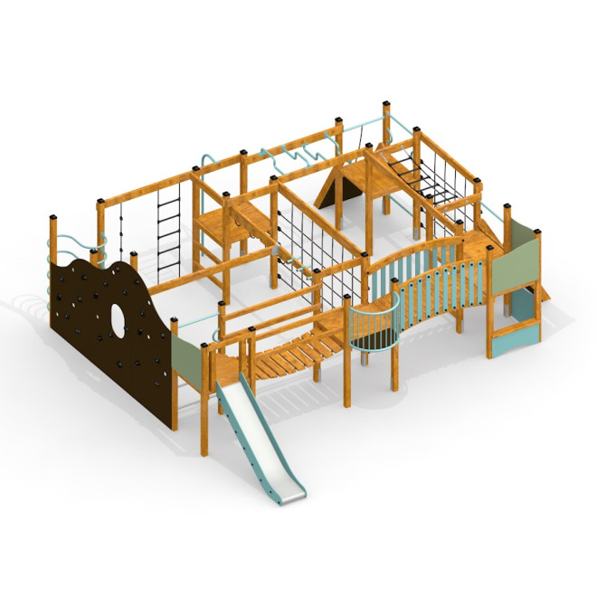 Questa struttura si integra perfettamente in parchi giochi pubblici, scuole e aree ricreative, stimolando l'attività fisica e la socializzazione tra i bambini. La combinazione di scivoli, ponti e arrampicate promuove lo sviluppo motorio e l'esplorazione in un contesto naturale e sicuro.